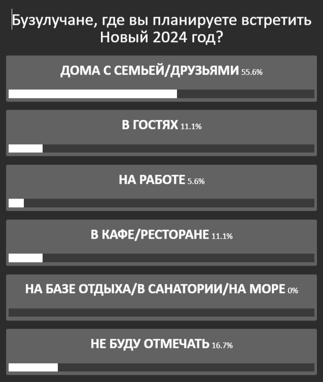 Интересно, что вторым по набору голосов стал вариант – Не буду отмечать – 16,7%. Видимо, многие устали от 2023 года… Примечательно, что в 2022 году этот ответ набрал всего 3,1% голосов бузулучан.