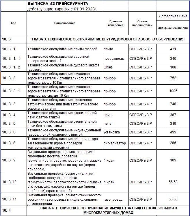 Тарифы, утвержденные на 2023 год, выросли. Так, техническое обслуживание газовой плиты теперь стоит 431 рубль (ранее - 322 рубля), ТО емкостного водонагревателя и отопительного аппарата мощностью до 10 Квт - 752 рубля (ранее - 551 рубль), мощностью свыше 10 Квт - 1005 (ранее 776 рублей). Полный список услуг с новыми ценами: