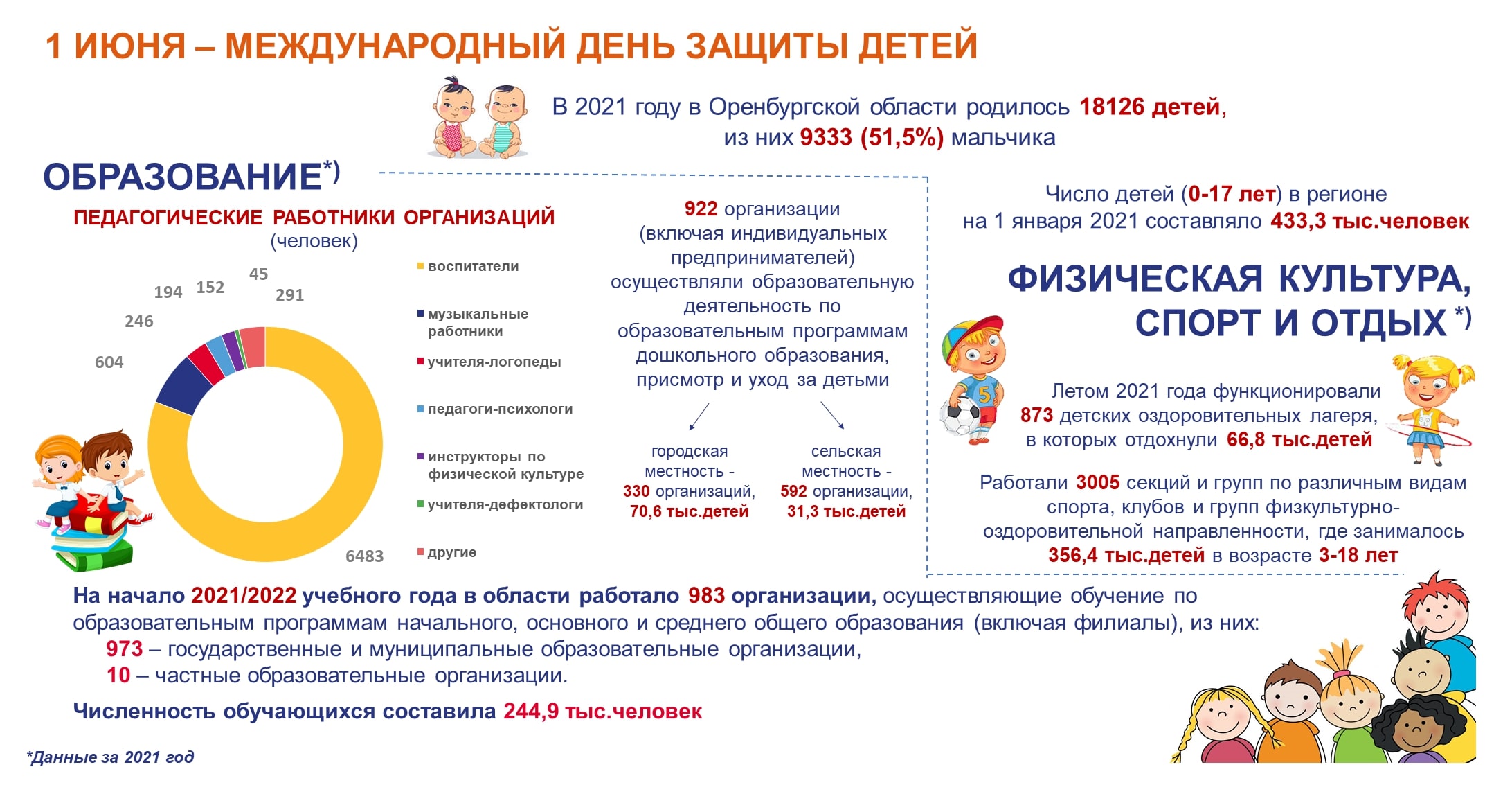 По данным Оренбургстата, в прошлом году в Оренбургской области родилось 18 126 детей, причем мальчиков появилось на свет больше (9333 малыша). Несовершеннолетних в регионе на 1 января 2021 года насчитывалось 433 300 человек.