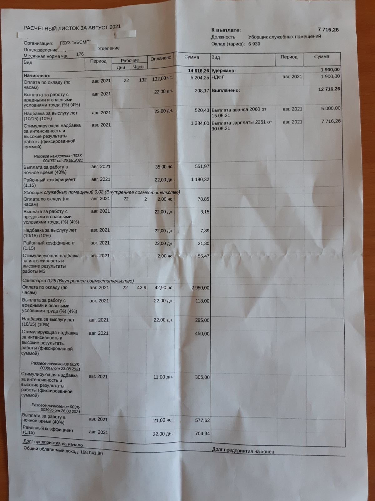 Сразу в нескольких бузулукских пабликах появились снимки расчетных листков сотрудников ГБУЗ "ББСМП". Судя по указанным в них данным, медицинская сестра палатная получила за август 15 705 рублей. Это с учетом работы с вредными и опасными условиями, работы в ночное время, стимулирующими надбавками за высокие результаты труда и прочими "бонусами".