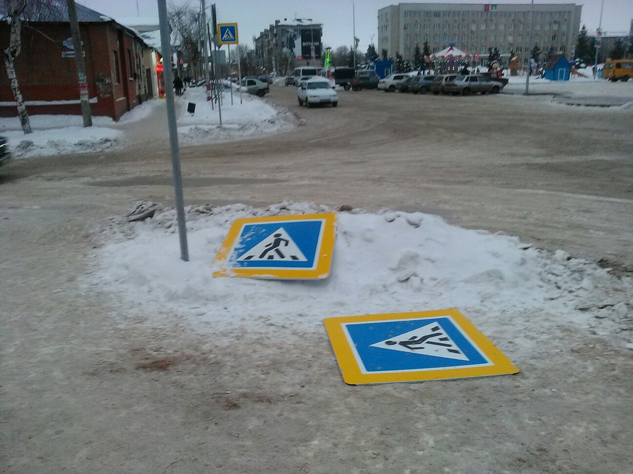 Снимок с оторванными знаками «Пешеходный переход», брошенными на перекрестке напротив администрации разместили в социальной сети вчера.