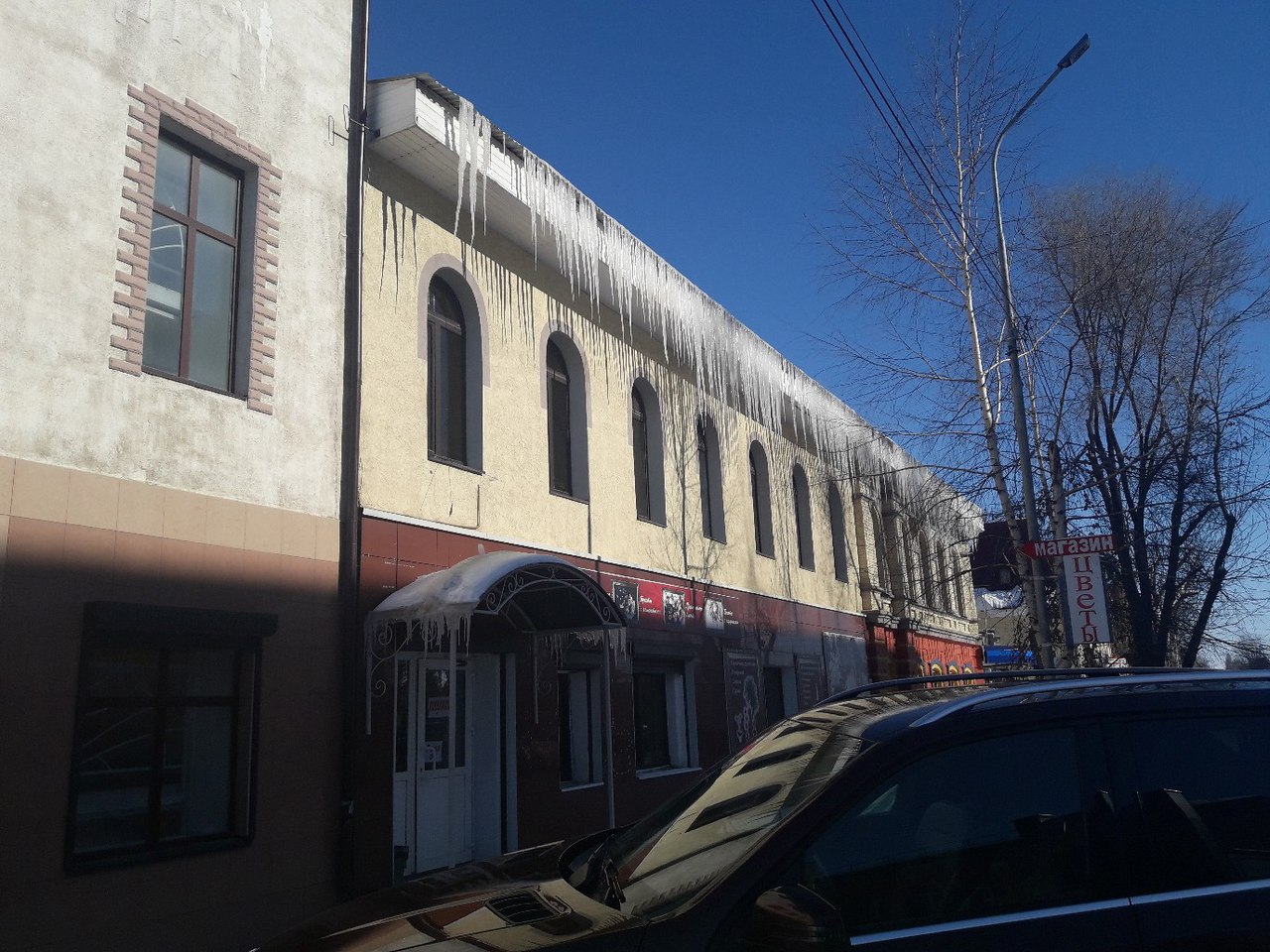 В социальных сетях появилась информация от жителей, что на многих зданиях города в нескольких метрах над пешеходами свисают большие глыбы льда, тающие на весеннем солнце. При этом никаких мер по ограждению территорий, на которых возможен сход снега и льда ни предпринимателями, расположившимися в зданиях, ни властями не предпринимаются, не говоря о банальной очистке крыш. Так более ста острых льдинок свисают со здания по улице М.Горького.
