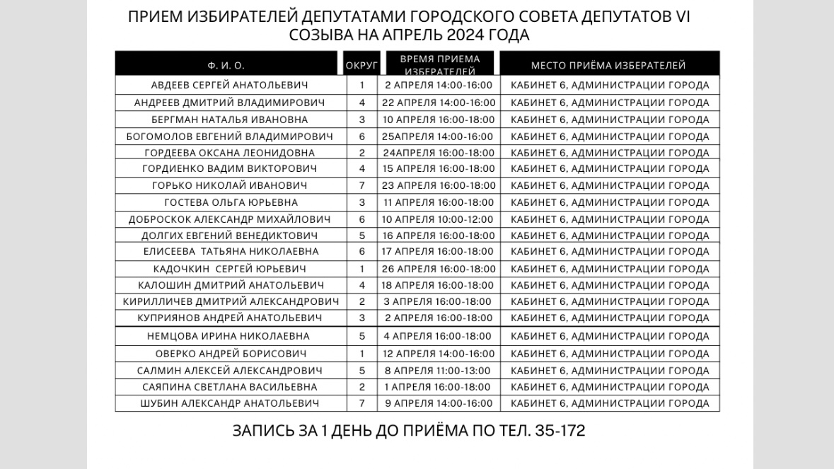 ПРИЕМ ИЗБИРАТЕЛЕЙ ДЕПУТАТАМИ ГОРОДСКОГО СОВЕТА ДЕПУТАТОВ VI СОЗЫВА НА АПРЕЛЬ 2024 ГОДА