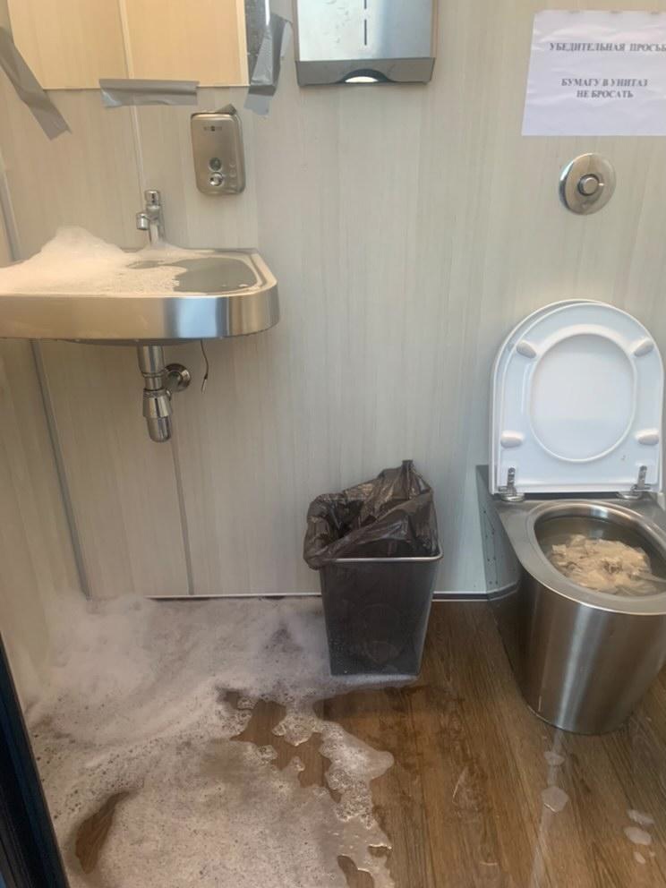 В местном паблике появилась информация о том, что в парке имени Пушкина кто-то испортил общественный теалет. На фото видно: унитаз забит бумагой, из него и из раковины, которая, видимо, также засорена, на пол льется вода.
