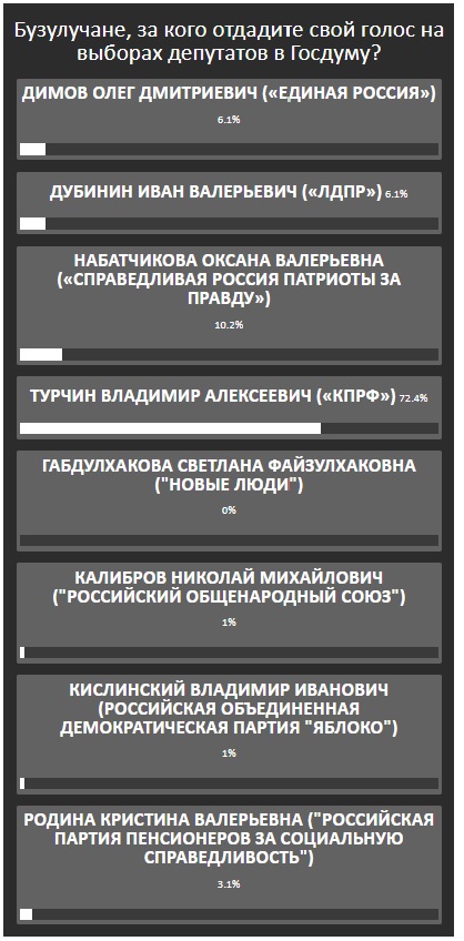 Единый день голосования уже не за горами – 19 сентября. Выборы депутатов Государственной Думы Федерального Собрания Российской Федерации восьмого созыва будут проходить в несколько дней с 17 по 19 сентября. Бузулук и Бузулукский район, наряду с другими территориями, входят в Избирательный округ №143, от которого выдвинули свои кандидатуры 8 человек. Результаты опроса сложились таким образом: