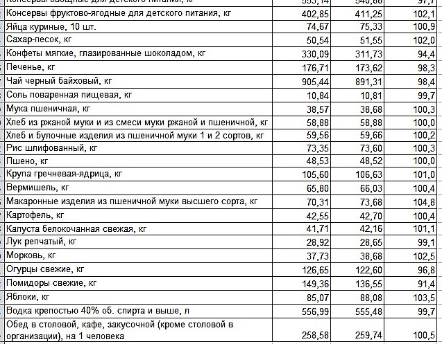 Итак, резко “подросли” в цене консервы для детского питания, как мясные (827,99 за кг до 845,79 рублей), так и фруктово-ягодные (с 402,85 за кг до 411,25 рублей). Увеличилась цена за килограмм на сахар-песок (с 50,54 до 51,55 рублей), крупу гречневую (с 105,60 до 106,63 рубля), масло сливочное (с 609,35 до 613,53 рубля), масло подсолнечное (с 127,85 до 126,15 рублей), морковь (с 37,73 до 38,68 рублей). Значительный рост отмечен на макаронные изделия (с 70,31 до 73,68 рублей за килограмм), рыбу мороженную неразделанную (с 187,41 до 190,02 рублей) и яблоки (с 85,07 до 88,08 рублей). Немного стали дороже куры охлажденные и мороженные (с 166,81 до 167,32 рублей за килограмм), сметана (с 214,84 до 215,10 рублей за килограмм), яйца (с 74,67 до 75,33 рубля за десяток).