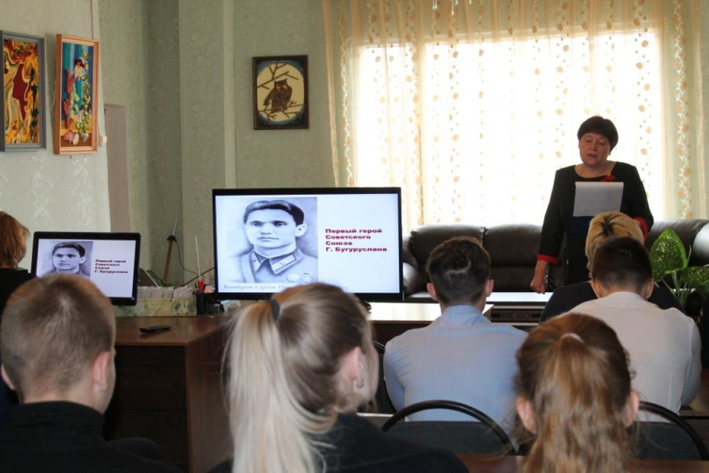 Библиотекарь рассказала ребятам о бугурусланцах, которые проявили примеры героизма и мужества. Это герой Советского Союза Сергей Никанорович Бамбурове и разведчик Даниил Алексеевич Прытков.