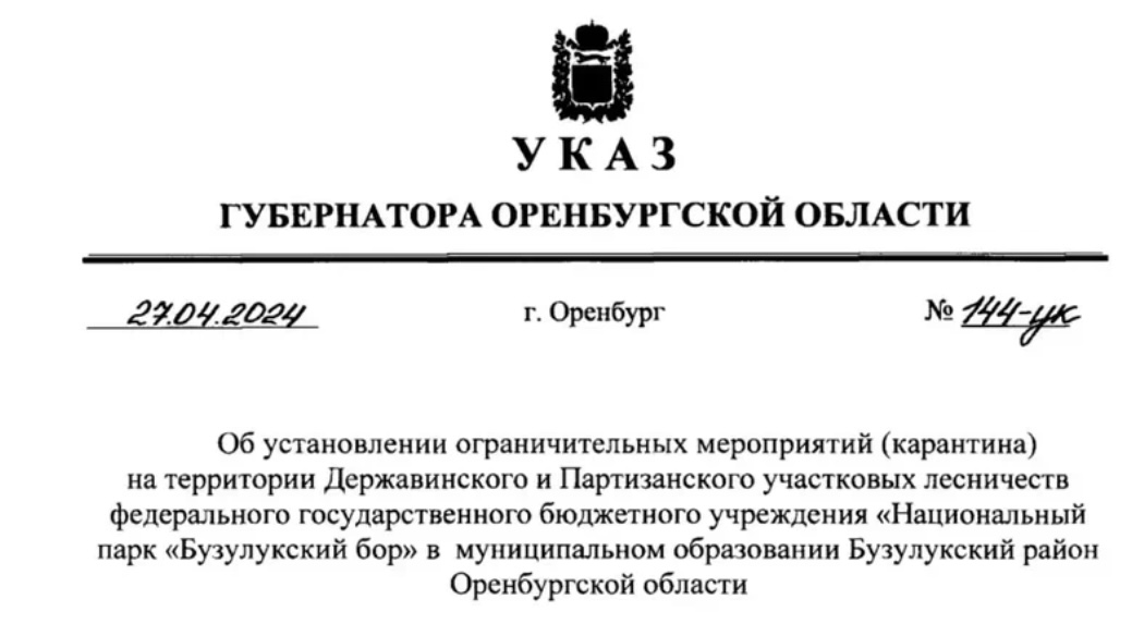 В соответствии с указом главы региона Дениса Паслера, введены карантинные меры на территории участковых лесничеств Державинского и Партизанского в Бузулукском районе национального парка.