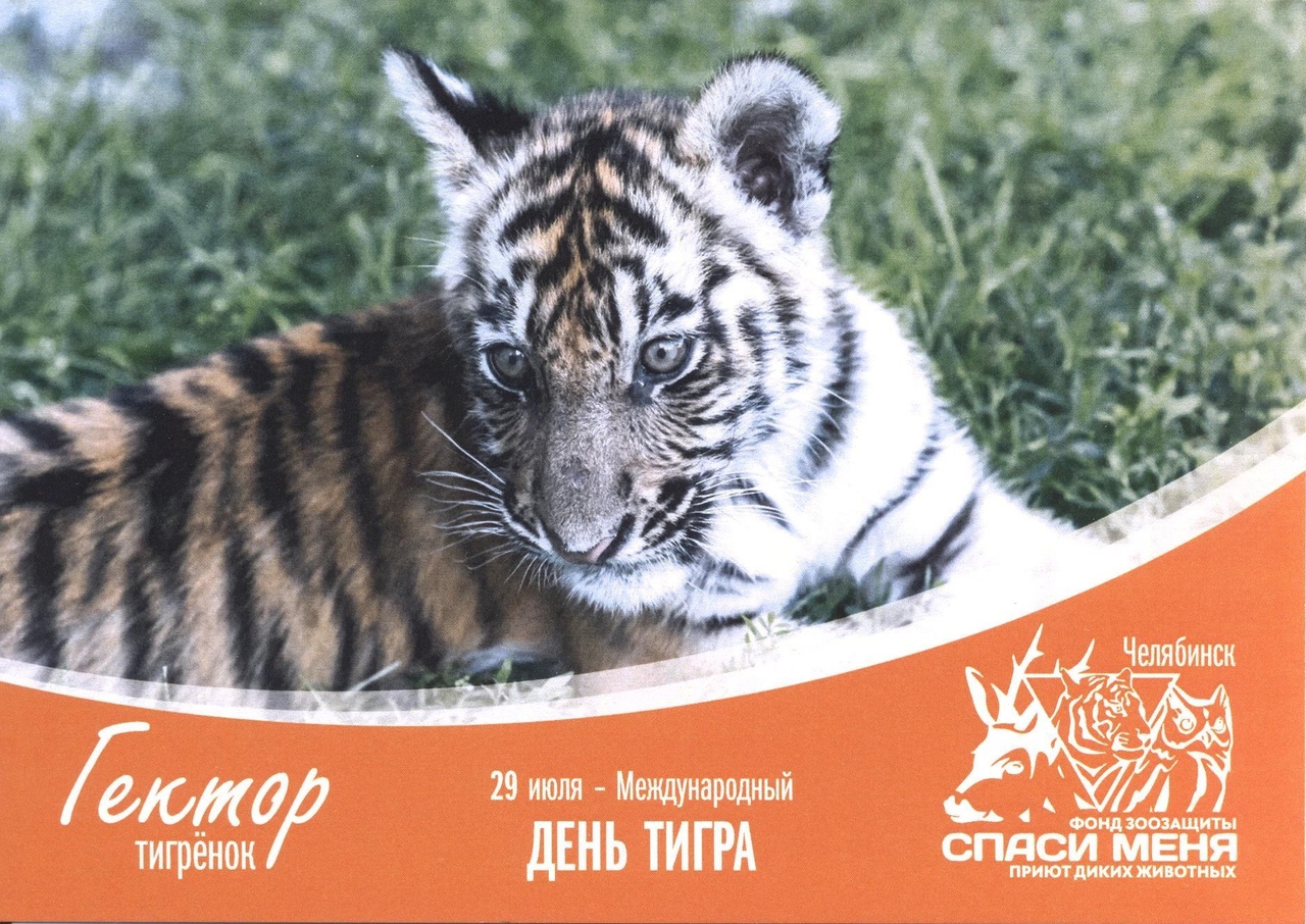 Тигренок Гектор сейчас проходит реабилитацию в челябинском приюте. По собственной инициативе друзья приюта специально к Международному дню тигра создали открытки с изображением Гектора.