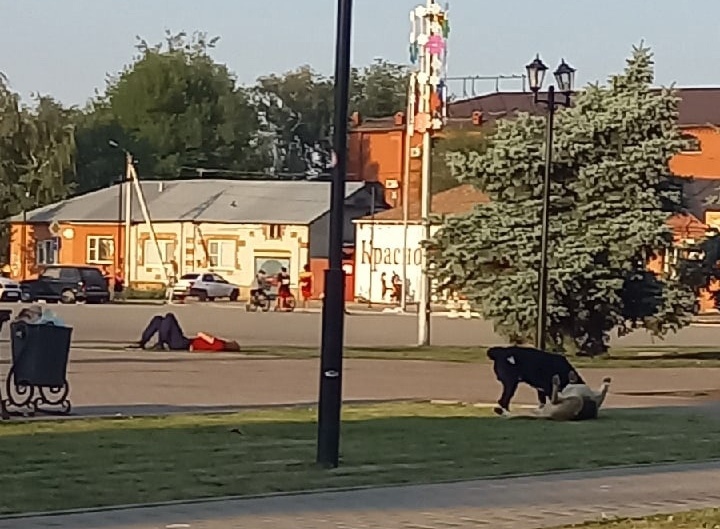 Апофеозом завершающихся выходных стал снимок из центра города - резвящиеся собаки и спящий пьяным сном гуляка в одном кадре.