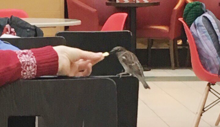 Действие происходит в ресторане быстрого питания одного из торговых центров Бузулука, куда залетела птица,- сообщает orenday.ru. Воробей оказался настолько наглым и голодным, что, никого не боясь, сел на край стола, за которым обедали люди. Бузулучане накормили бедолагу булочкой от фастфуда. Менее чем за сутки видеоролик набрал более 9 500 просмотров.