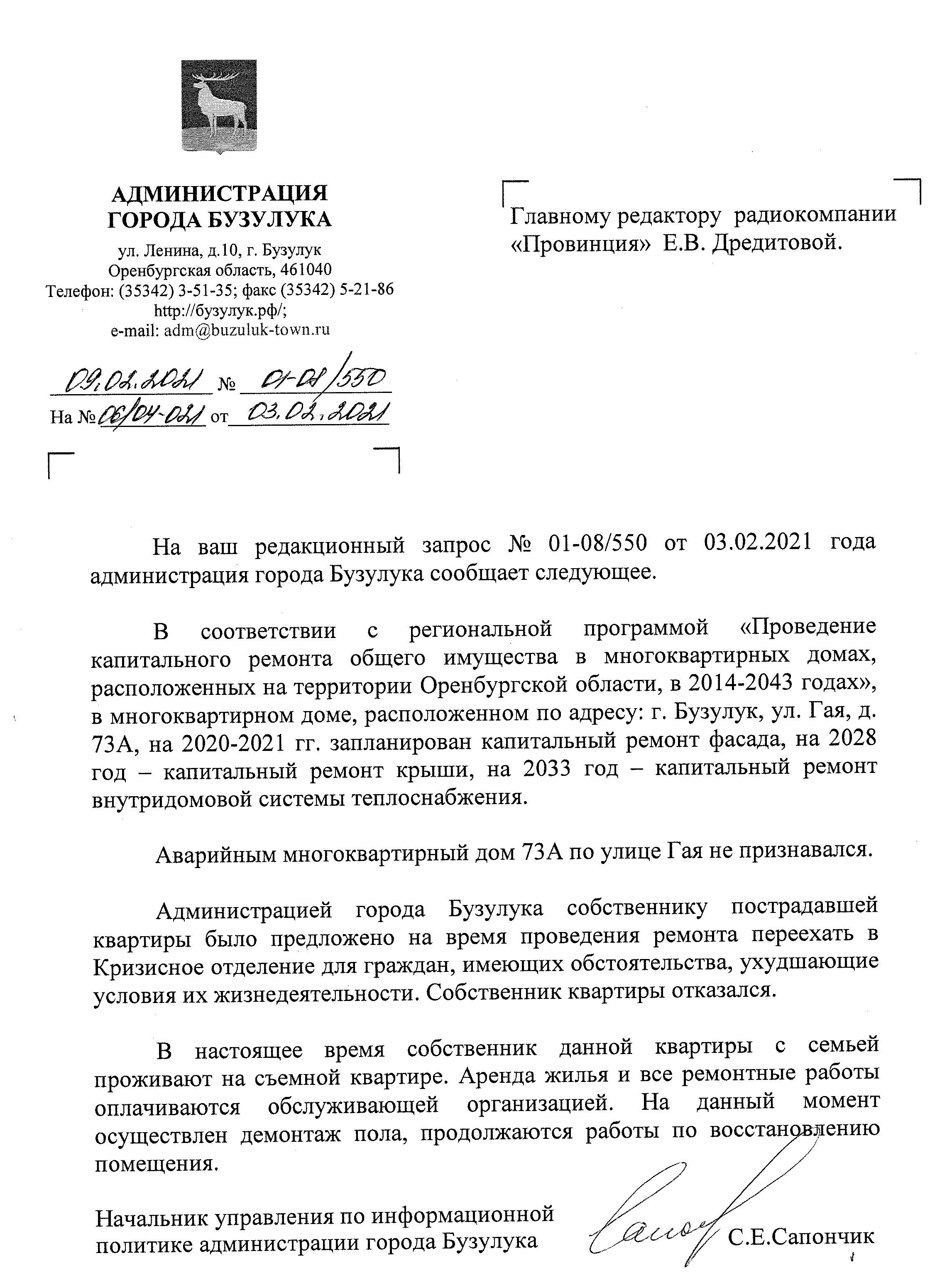 Информационно-новостной портал buzulukday.ru получил официальный ответ на редакционный запрос от администрации города Бузулука. В нем чиновники поясняют, что капитальный ремонт фасада дома по адресу улица Гая, 73а запланирован на 2020-2021 годы. Крышу капитально отремонтируют через семь лет - в 2028 году. А вот капремонта внутридомовой системы теплоснабжения придется ждать дольше всего - это должно произойти по плану только в 2033 году. Жители, мягко говоря, удивлены такому ответу, ведь именно состояние теплосети стало причиной происшествия.