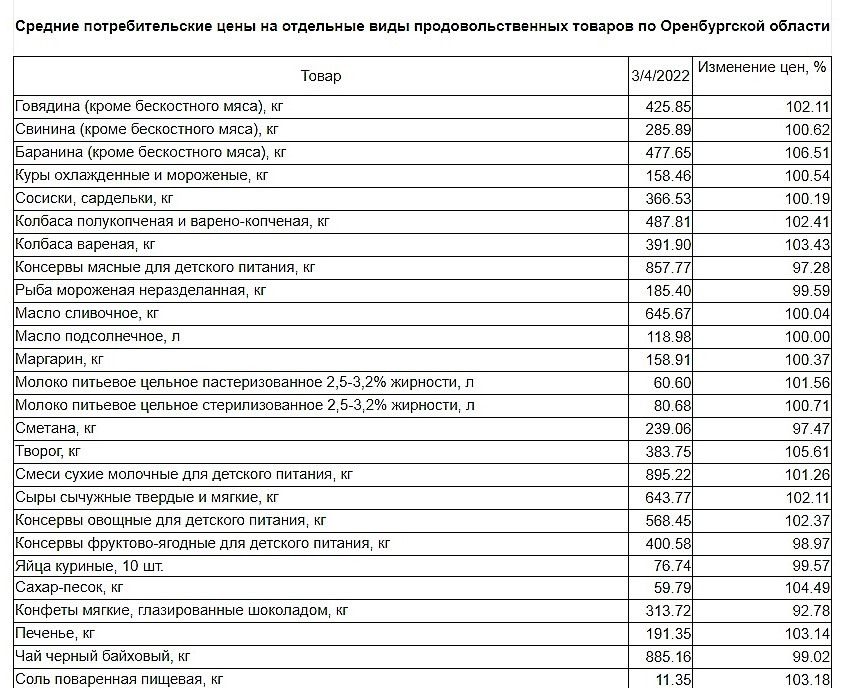 По данным Оренбургстата, выросла цена за килограмм мяса, а именно говядина - 425.85 рублей (в процентном соотношении 102.11%) и баранина - 477.65 (106.51%). Кроме того, отмечается повышение стоимости свежих овощей, таких как морковь - 43.82 рублей (104.04%), огурцы - 191.81 рублей (101.48%) и помидоры - 194.85 рублей (107.28%). Не отстают фрукты, например, килограмм яблок стоит 93.04 рублей (103.42%), а бананов - 96.36 рублей (106.62%). Вермишель и крупа гречневая-ядрица тоже подорожали - 73.40 рублей (102.56%) и 112.01 рублей (101.13%) соответственно. Так же поднялась цена на сахар-песок - 59.79 рублей (104.49%). Однако, если говорить не об официальной статистике, а о том, что бузулучане видят ежедневно на прилавках магазинов, цены на сахар в некоторых торговых точках на сегодняшний день добрались уже до значения 115 рублей за килограмм.