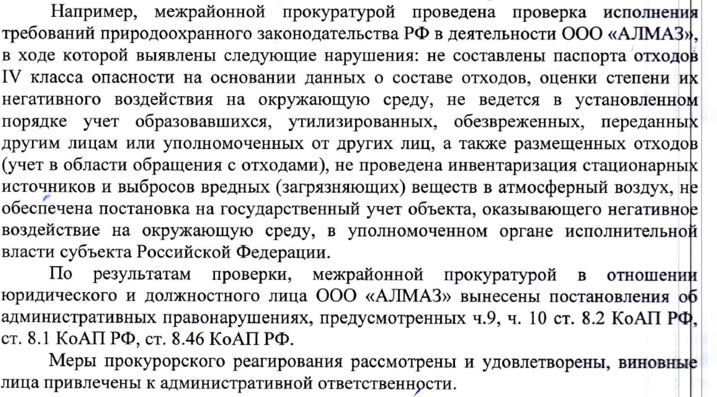 На днях редакция направила информационный запрос в Бузулукскую межрайонную прокуратуру, чтобы узнать, как ведется соблюдение природоохранного законодательства предприятиями города и района. В ответ получены следующие сведения: