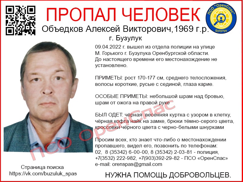 Просим всех, кто знает что-либо о местонахождении пропавшего, видел его, позвонить по телефонам: 02, 8 (35342) 6-00-00, 8 (35342) 2-03-81 - полиция, +7(3532) 222-982, +7(903)392-29-82 - ПСО «ОренСпас» e-mail: orenspas@gmail.com