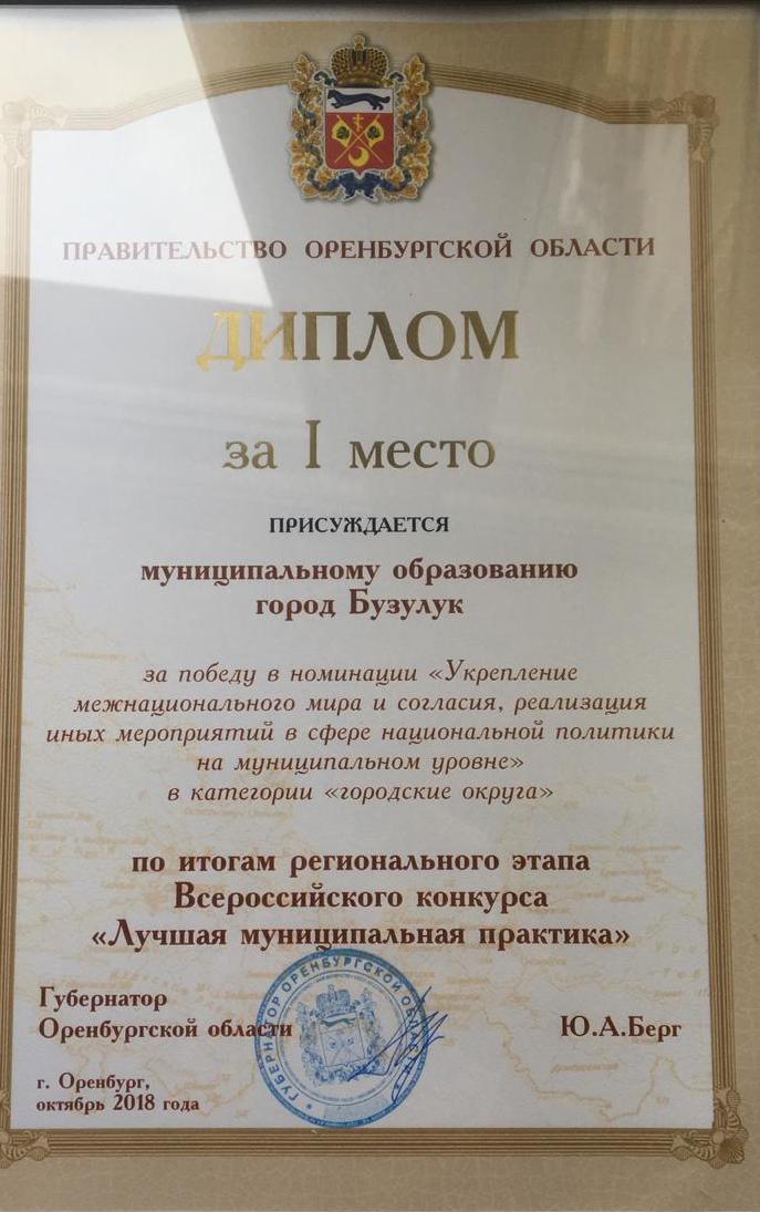 В конце недели город Бузулук был отмечен диплом за первое место в номинации «Укрепление межнационального мира и согласия, реализация иных мероприятий в сфере национальной политики на муниципальном уровне». Номинация была присуждена в рамках пленарного заседания VI съезда Всероссийского совета местного самоуправления прошла церемония награждений победителей всероссийского конкурса «Лучшая муниципальная практика».
