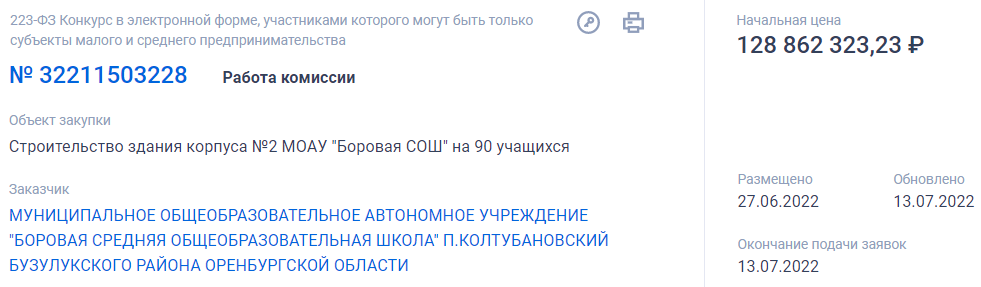 На сайте госзакупок выставлен проект муниципального контракта "Строительство здания корпуса №2 МОАУ "Боровая СОШ" на 90 учащихся" в п. Колтубановский. Начальная цена - 128 862 323 рубля. В настоящее время принимаются заявки от потенциальных подрядчиков.
