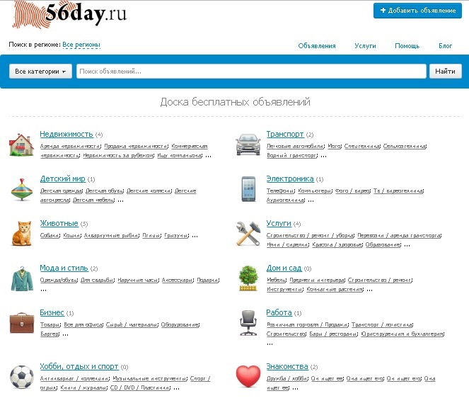 На 56day.ru можно не только найти нужный вам товар по привлекательной цене, но и самим разместить объявление. Решили продать квартиру, приобрести автомобиль, завести симпатичного питомца, тогда вам - сюда. Дря размещения своей информации достаточно нажать кнопку «Добавить объявление» и заполнить необходимые разделы.