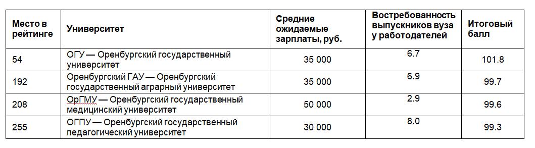 В 5-ку лучших вузов страны, выпускающих самых востребованных и успешных специалистов, вошли НИУ ВШЭ, РАНХиГС, Университет «Синергия», СПбПУ и МГУ имени М.В. Ломоносова. Среди вузов Оренбургской области в рейтинг попали сразу 4 учебных заведения, наиболее высокую строчку занял ОГУ - Оренбургский государственный университет - он оказался на 54 месте.