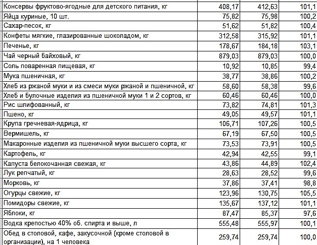 Некоторые продовольственные товары не изменились в цене. Например, куры охлажденные и мороженные, маргарин, чай черный байховый. Обед в столовой тоже стоит, как и раньше - 259,74 рубля за человека.