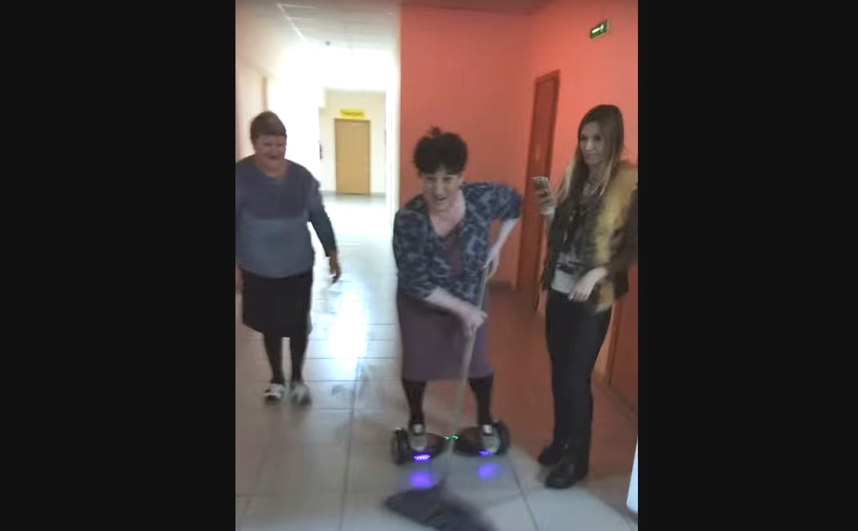 По словам Андрея, гироскутер на работу принес кто-то из сотрудников, работающих в офисе. Ради забавы встать на него предложили Нине Александровне. А та умудрилась не только управлять мини-транспортом, но и при этом мыть пол!