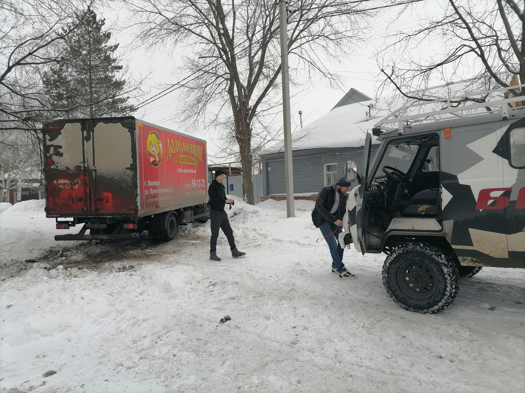 На улице Интернациональной застрял грузовик с мебелью. Одного только груза в нем - 300 килограммов. Машина с надписью "Дом мебели" прибыла из Оренбурга. Мужчины не знали ни города, ни к кому обратиться за помощью. Благо, очевидцы сообщили о них участникам группы "Автопомощь Бузулук". Сердобольная женщина, которая видела из окна, как мучаются оренбуржцы, вынесла им горячий чай и конфеты.