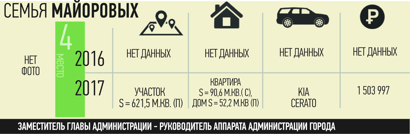 Семье руководителя аппарата администрации Натальи Александровны Майоровой в 2017 удалось заработать 1 503 997 рублей. У семьи есть квартира, дом, земельный участок и автомобиль КИА.