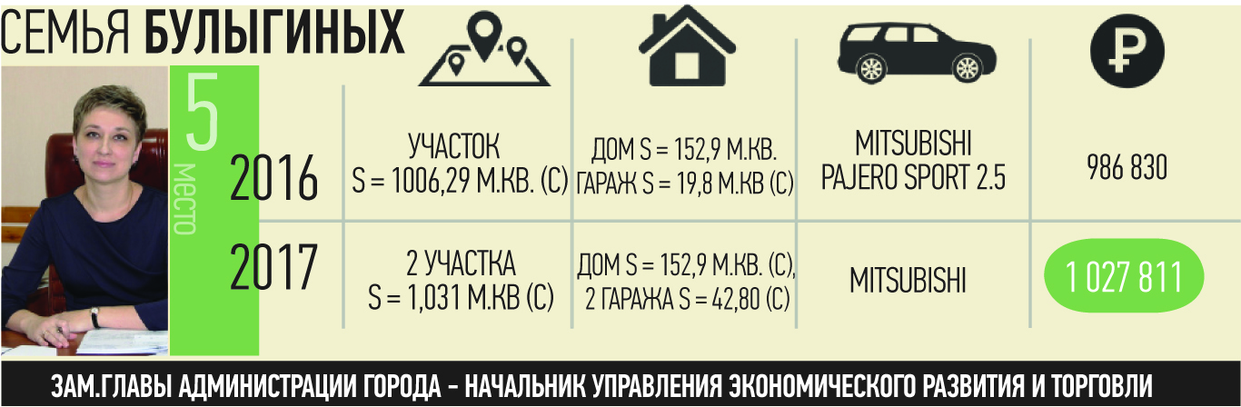 Последней семьёй, заработавшей за год больше миллиона рублей, в рейтинге служащих администрации стала семья Булыгиных. Наталья Константиновна - начальник управления экономического развития и торговли. Семейный годовой доход составил 1 027 811 рублей, что на 40 981 рублей больше, чем в прошлом году. Семья имеет в собственности два земельных участка, дом, два гаража и автомобиль.