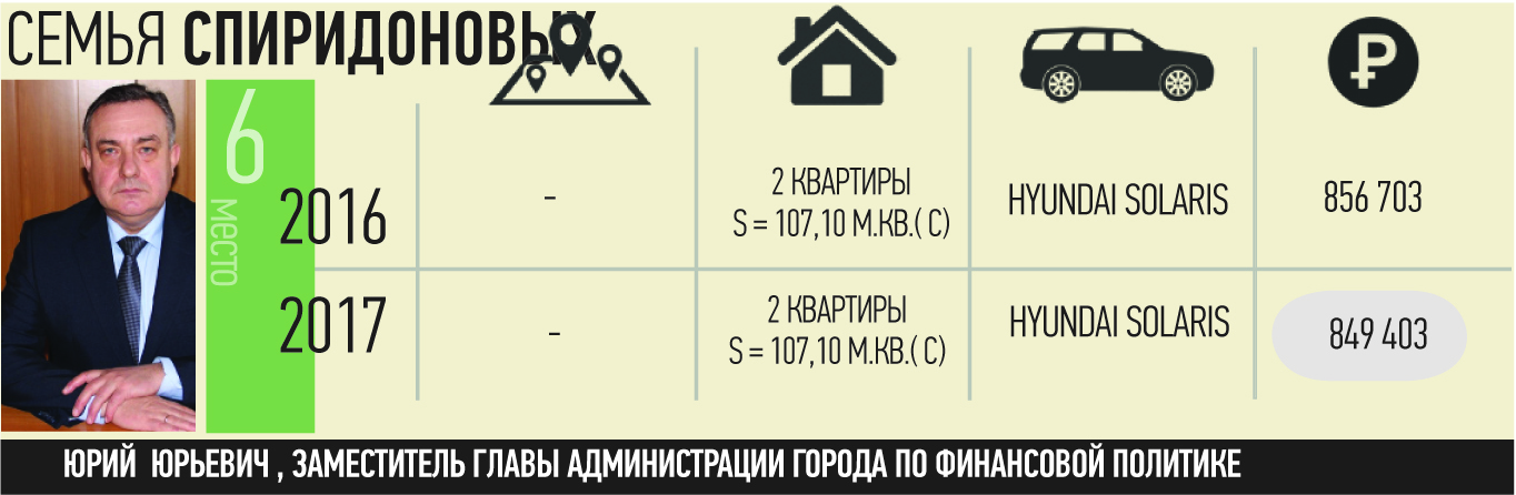 Свой миллион, согласно предоставленной в налоговую информации, еще не заработала семья заместителя главы администрации по финансовой политике Юрия Юрьевича Спиридонова. Общий доход семьи в этом году составил 849 403 рублей, что на 7 300 рублей меньше прошлого года. В собственности у Спиридоновых 2 квартиры и автомобиль.