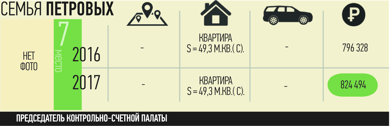 Семья Натальи Алексеевны Петровой - председателя контрольно-счетной палаты заработала 824 494 рубля. Квадратура жилой площади с 2016 года осталась прежней. Семья не обзавелась ни собственным земельным участком, ни автомобилем.