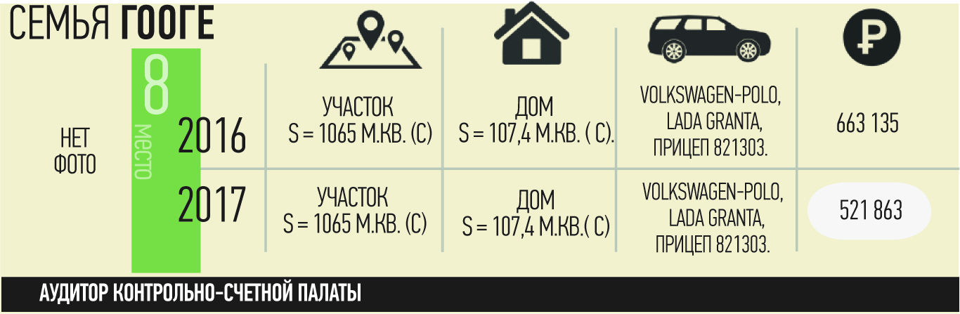 Не стала миллионером в этом году и семья Елены Викторовны Гооге - аудитора контрольно-счетной палаты. Эта семья заработала за год в три с половиной раза меньше лидера рейтинга – 521 863 рубля, их доход в сравнении с прошлым годом уменьшился на 141 272 рубля. Квадратура земельного участка, жилплощади и наличие транспортных средств относительно 2016 года остались неизменны.