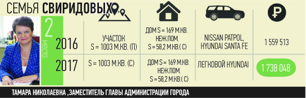На втором месте по сумме годового дохода семья Свиридовых - второго заместителя главы. Доход семьи в 2017 году по сравнению с прошлым годом увеличился на 178 535 рублей и составил 1 559 513 рублей. Семье Тамары Николаевны в минувшем году пришлось расстаться с одним автомобилем. Площадь участков и жилых квадратных метров осталась прежней.
