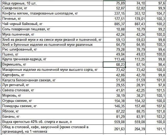 Есть товары, которые заметно упали в цене. Например, колбаса полукопченая и копчено-варенная (от 465,75 до 456,56 рублей за килограмм), колбаса вареная (от 377,84 до 359,07 рублей за килограмм), консервы фруктово-ягодные для детского питания (от 421,21 до 409,64 рубля). Немного подешевели свинина, куры охлажденные и мороженые, рыба мороженая неразделанная, масло сливочное, яйца куриные, сахар-песок, соль поваренная пищевая, рис шлифованный, вермишель, лук репчатый.
