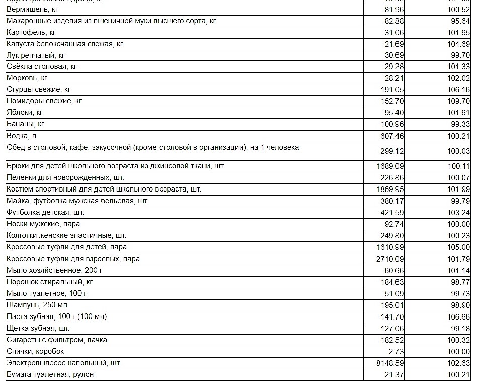 Среди непродовольственных товаров отмечается рост цен на кроссовые туфли для детей, детские футболки, костюм спортивный для детей школьного возраста. Также стали стоить больше мыло хозяйственное, зубная паста, электропылесос напольный, подгузники детские бумажные, телевизор, смартфон.