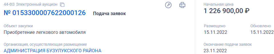 Место поставки товара - поселок Красногвардеец Бузулукского района, в графе "заказчик" значится "Администрация муниципального образования Красногвардейский сельсовет". Начальная цена контракта - 1 226 900,00 рублей.