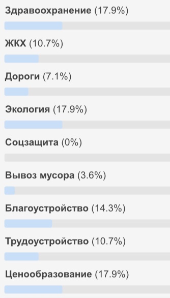 Самыми «больными точками» местные жители считают здравоохрание, экологию и ценообразование. На втором месте оказались вопросы благоустройства, опередив по количеству голосов даже сферу ЖКХ, которая на этот раз стала на четвертой позиции вместе с темой трудоустройства.