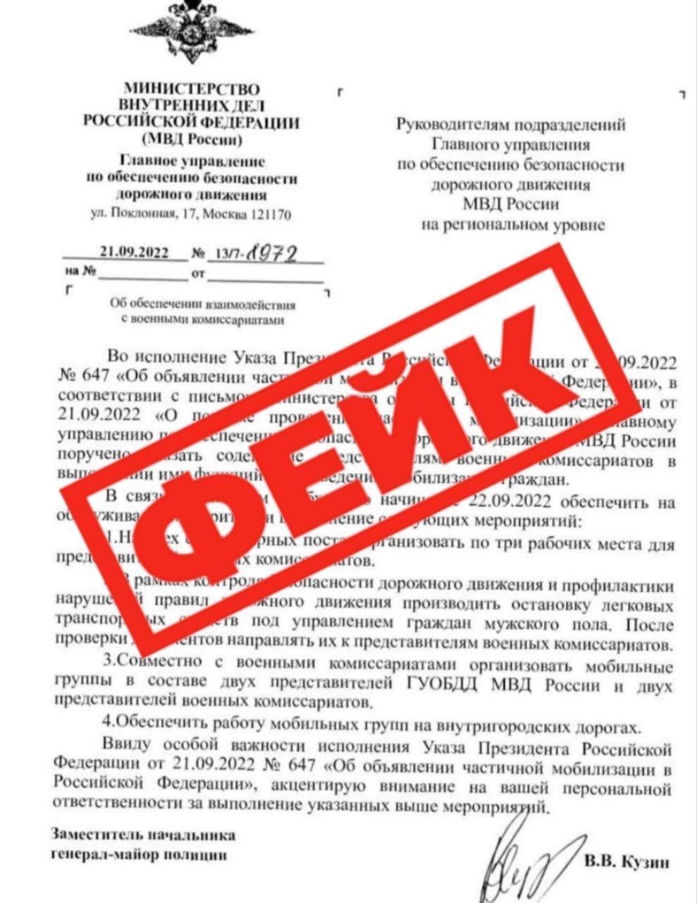 В соцсети, а также в некоторых СМИ, стали активно распространяться ложные сообщения, связанные с объявленной Владимиром Путиным частичной мобилизацией. Так, например, в интернете появился документ, внешне очень похожий на настоящий. В нем сообщается о том, что сотрудники ГИБДД совместно со служащими военкоматов якобы обязуются останавливать молодых водителей, потенциально подлежащих мобилизации, и отправлять их в военные комиссариаты.