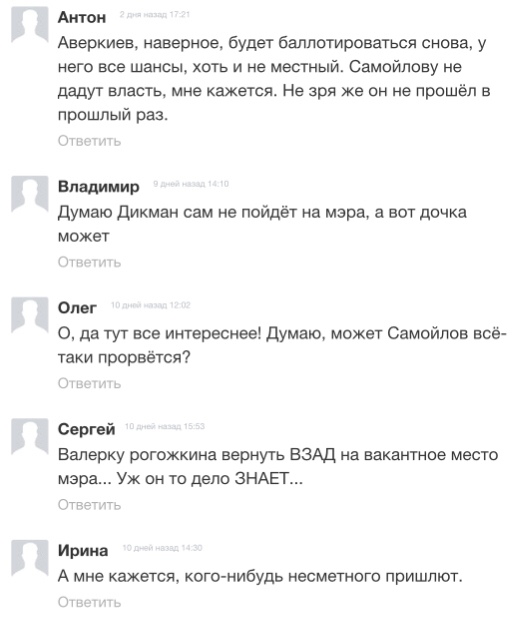 В социальных сетях граждане предложили добавить в голосование депутата горсовета Евгения Долгих и депутата Законодательного Собрания области Владимира Турчина. Кроме того, пара комментаторов не прочь, чтобы место главы закрепилось за временником Песковым.