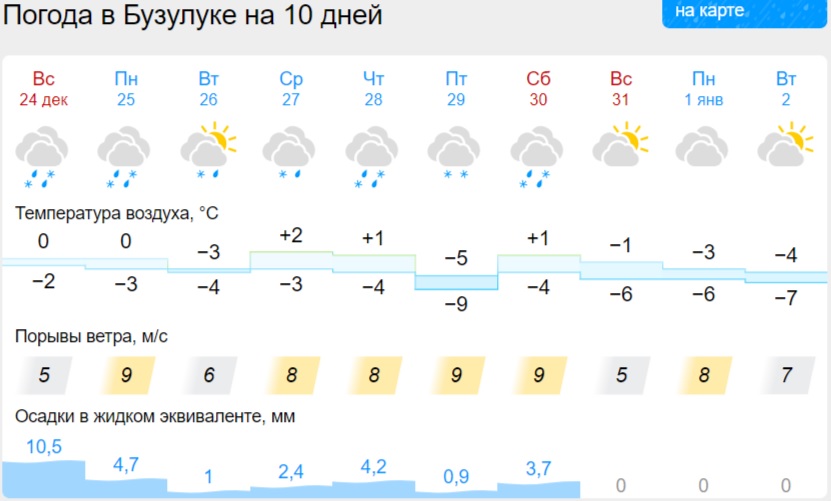 30 и 31 декабря в Бузулуке будет тепло, днем +1 и -1. В новогоднюю ночь мороз едва опуститься до -4, осадков не ожидается.