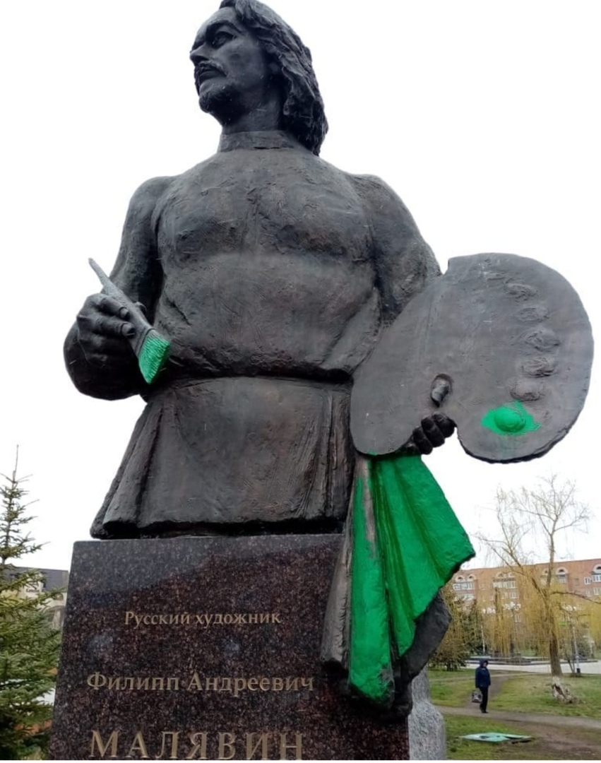 Неизвестные раcкрасили палитру, а также кисть и салфетку в руках живописца в зеленый цвет. Сейчас производятся все необходимые мероприятия для того, что бы скорее разыскать уже современных любителей творчества нашего земляка Филиппа Андреевича Малявина, который является уроженцем с. Казанка Бузулукского уезда (1869-1940 гг.). Среди его самых известных работ: \"Вихрь\", \"Крестьянская девочка\", \"Бабы\" и многие другие.