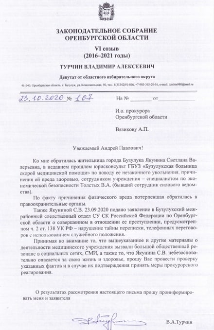 Напомним, бывшая сотрудница Бузулукской больницы скорой медицинской помощи записала видеообращение к россиянам. Ролик женщина отправила в федеральные СМИ. Кроме того, она написала заявления в правоохранительные органы, в том числе в Бузулукский межрайонный следственный отдел СУ СК Российской Федерации по Оренбургской области. Также Светлана Валерьевна отправила письма руководителю Минздрава Оренбургской области Татьяне Савиновой и министру здравоохранения России Михаилу Мурашко. В них бывшая юрисконсульт указывает ещё на одно возмутительное обстоятельство.