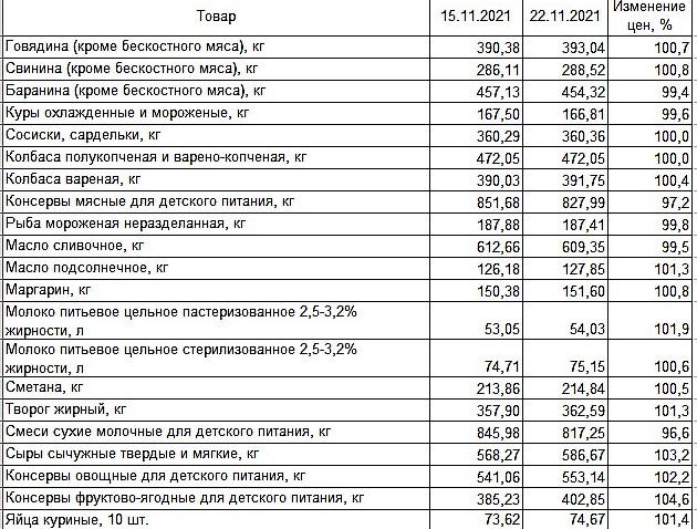 Согласно опубликованным данным Оренбургстата, резко в цене «набрали» творог жирный (с 357,90 до 362, 59 рублей за килограмм) и консервы фруктово-ягодные для детского питания (с 385,23 до 402,85 рублей). Подорожал и картофель (с 41,44 до 42,55 рублей). Дороже стали говядина (с 390,38 до 393,04 рубля), свинина (с 286,11 до 288,52 рубля), колбаса варенная (с 390,03 до 391,75 рублей), масло подсолнечное (с 126,18 до 127,85 рублей), сыры сычужные твердые и мягкие (с 568,27 до 586,67 рублей), консервы овощные для детского питания (с 541, 06 до 553,14 рублей), сахар (с 49,87 до 50, 54 рубля).