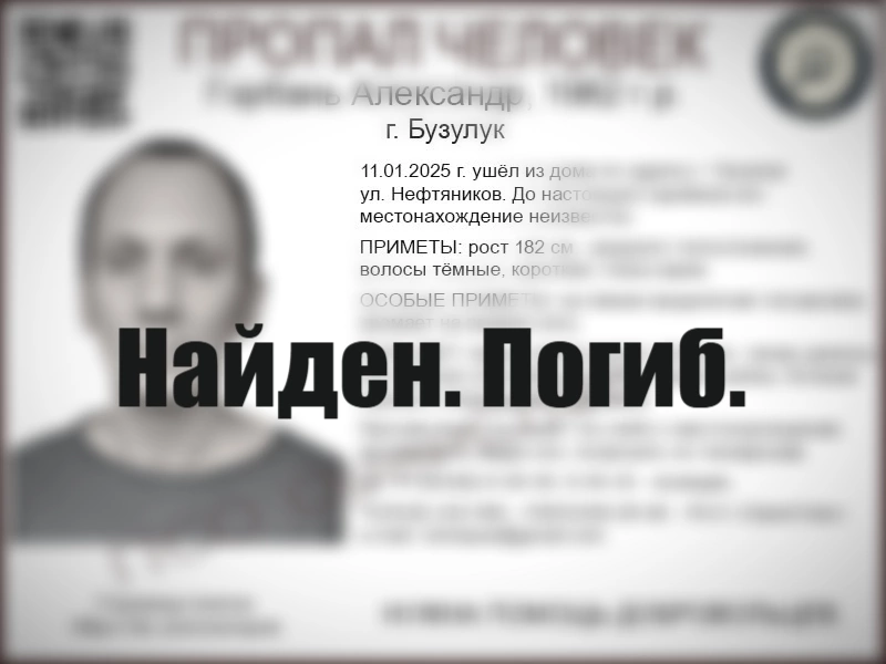 27 января поисковики Бузулукского подразделения ПСО «ОренСпас» совместно с полицейскими провели масштабную операцию по поиску Александра Горбаня. В течение дня волонтёры и сотрудники обследовали поля, овраги, заброшенные здания и лесополосу. К сожалению, поиски завершились трагически: пропавший мужчина был найден мертвым.