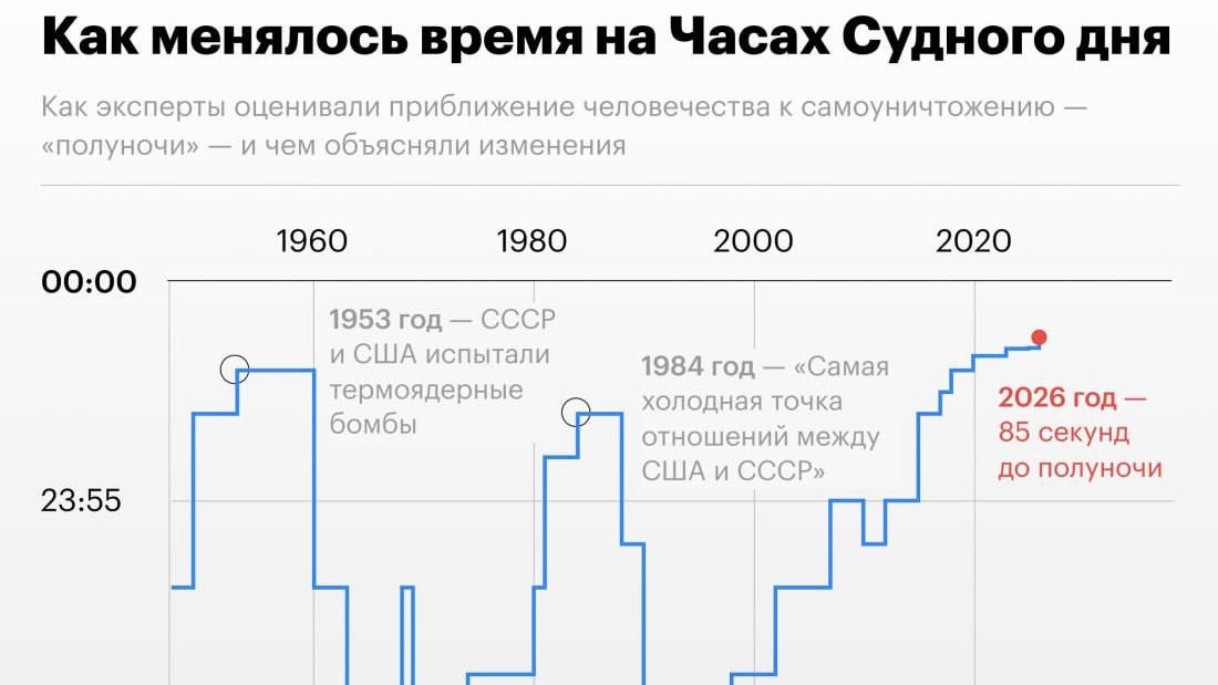Стрелки «Часов Судного дня» за год перевели ещё на 4 секунды — теперь они показывают 85 секунд до «ядерной полуночи». Это самый тревожный показатель за всю историю проекта с 1947 года, символизирующий максимальный уровень глобальных угроз.