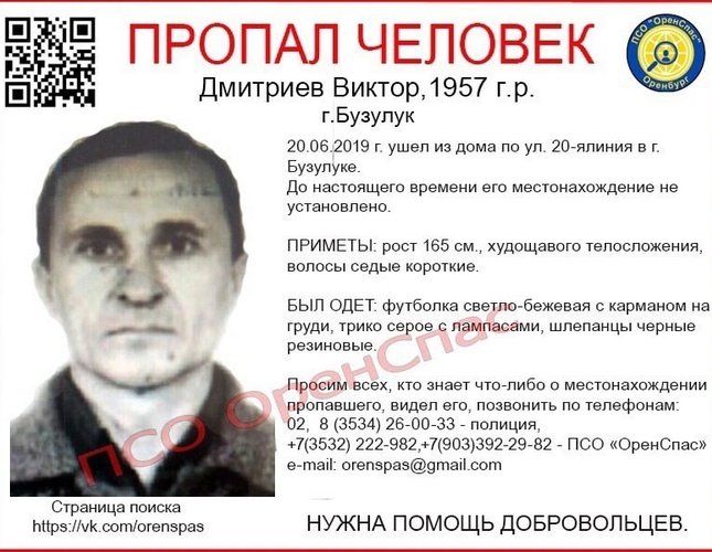 Двое их них исчезли в 2015 году: это Вениамин Пятерев из Алдаркино (1943 г. р.) и Александр Баев (1955 г. р.) из Сухоречки. Еще двоих ищут с 2019 года: Анатолия Петрова (1951 г. р.) из Курманаевского района и Виктора Дмитриева (1957 г. р.) из Бузулука.