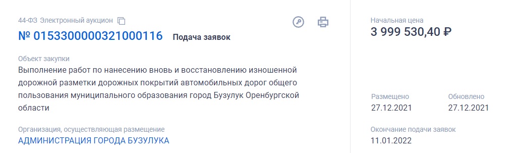 Вчера на сайте госзакупок появился лот "Выполнение работ по нанесению вновь и восстановлению изношенной дорожной разметки дорожных покрытий автомобильных дорог общего пользования муниципального образования город Бузулук Оренбургской области". Изначальная сумма контракта указана в размере 3 999 530,40 рублей. Как известно, в ходе аукциона, эта цена может быть снижена.