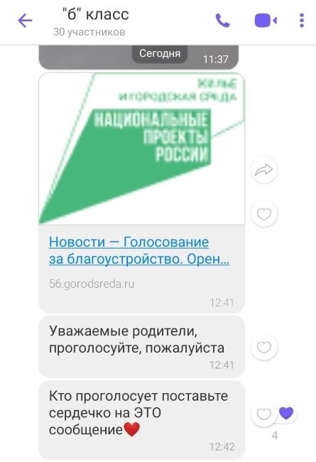 Как пишет orenday.ru, классные руководители оренбургских школьников массово рассылают в классных группах в мессенджерах сообщения с просьбой проголосовать, пройдя по указанной ссылке. Причем, не просто проголосовать за любое из общественных пространств, а еще и отметиться сердечком в числе проголосовавших. Родители в недоумении: