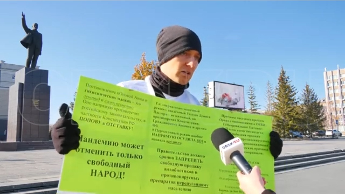 - Моя акция протеста посвящена тому, что политические решения, которые принимаются государственными органами России, ставят под угрозу жизнь и здоровье граждан. В частности, если Попова вводит всеобщий масочный режим, не ограничивая ни возраст, ни противопоказания никакие (в этих постановлениях ничего не говорится о стандартах безопасности этих изделий), то при ношении масок — вот этих гигиенических, как они указаны в постановлении — могут возникнуть проблемы со здоровьем, в том числе и летальные исходы. Я уже как блогер насмотрелся на видео, где люди в масках теряют сознание. Это не просто какие-то страшилки. Людям действительно становится плохо, - заявил орчанин.