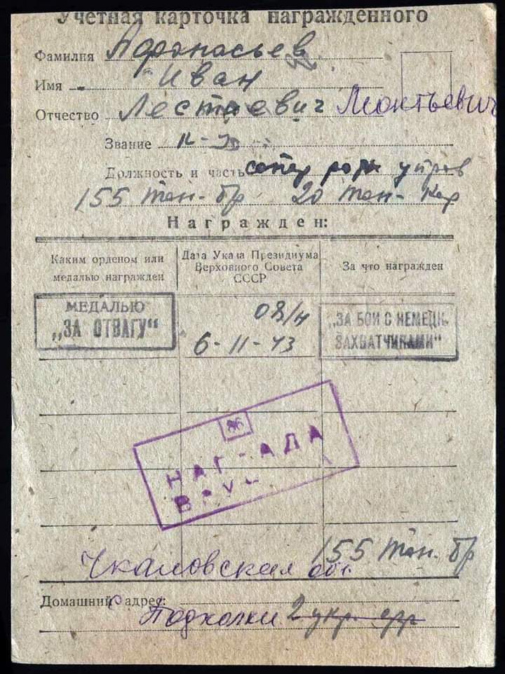 Мне позвонили из поисковой организации, - написала в сети растроганная до слез женщина. - Это мой дед, Афанасьев Иван Леонтьевич. Его жена - моя бабушка Анастасия Ларионовна. Мне переслали фотографии медали и наградой лист! Огромное вам спасибо за ваш труд и память! - обратилась наша землячка к отряду.