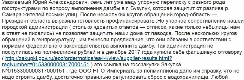 Проблему защиты нескольких улиц Бузулука от разлива реки Самара в весенний период жители города озвучили в блоге губернатора Оренбургской области Юрия Берга. По их словам, регулировка сброса с Сорочинского водохранилища не решает проблемы подтопления, однако администрация не предпринимает действий для защиты жителей от половодья.